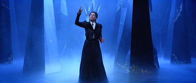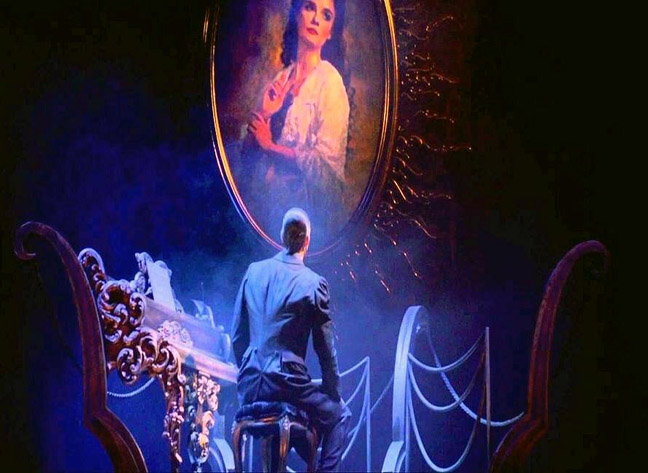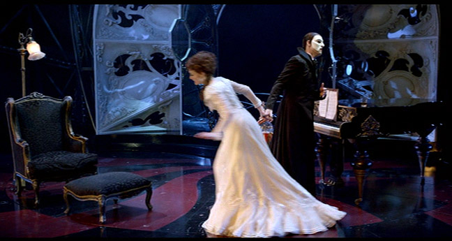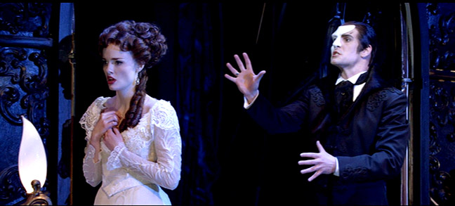 And her memories of their love and the shock of seeing him alive after thinking of him dead for ten years, rush in on her and cause her to faint. The early part of the scene is much like a wedding ceremony – to the point that the Phantom is in an elegant evening coat and Christine Daaé in an exquisite ivory dress that could easily be a wedding gown. Like any groom, he picks her up into his arms, to cross the fantasy threshold, perhaps in his mind he is remembering picking her up into his arms long ago. And so begins the Beneath a Moonless Sky grand love duet, filling the viewer in on their past and their one secret night of abandonment of soul and body to each other.