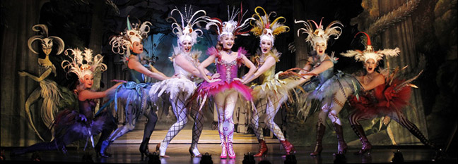 “Ooh-la-la Girl”, Meg Giry, played by Sharon Millerchip (centre, in bright pink costume) and the other Phantasma dance hall girls pose in a publicity photo. (Photo: Jeff Busby)