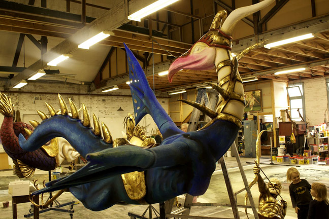 A mythical carousel dragon in the workshop. To see more of the Phantasma carousel creatures during their construction: roryunite.blogspot.ca