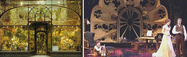 Both inspired by the Art Nouveau movment – A late 19th century flower shop, the still-standing Danile Ost, Florist in Bruxelles, Belgium similar in design to the Coney Island hotel suite, featuring Jack Lyall, Anna O'Byrne and Simon Gleeson in the early 20th century in Love Never Dies