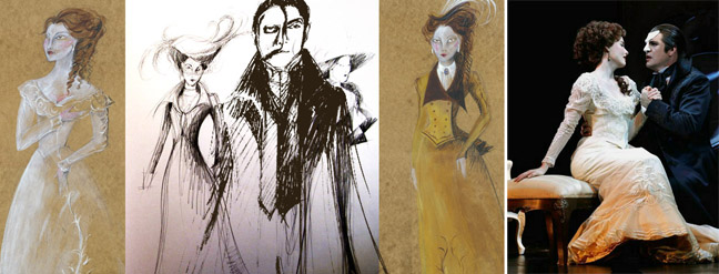 Costume sketches by Gabriela Tylesova for Christine's ivory dress, and the Phantom's evening clothes.