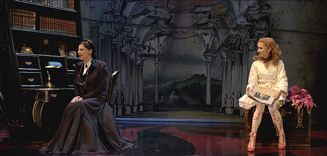 Mercedes and Millerchip as mother and daughter expertly employed all the shades of subterfuge of their characters' more macabre inclinations. (In fact, most of the actors in the LND filmed production skillfully emoted very much with their eyes – which is such a thrill to see in this day and age when many modern films favour muscle and wardrobe malfunctions over acting talent – the emoting reminiscent of what viewers were accustomed to in the era of silent film. This may have been intentional, or just a bonus from the cast having had so much experience performing the play; the moment the costumes went on, they became the characters.)