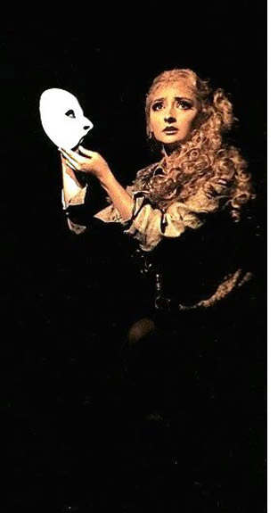 Sharon Millerchip as Meg Giry holding the Phantom's mask in a publicity photo from the 1990 Australian production of The Phantom of the Opera